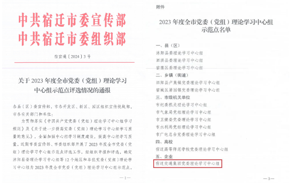 日前,市委宣传部、市委组织部印发《关于2023年度全市党委(党组)理论学习中心组示范点评选情况的通报》,宿迁交通集团党委理论学习中心组获评2023年度全市党委(党组)理论学习中心组示范点。这也是全市唯一一家企业获此殊荣。