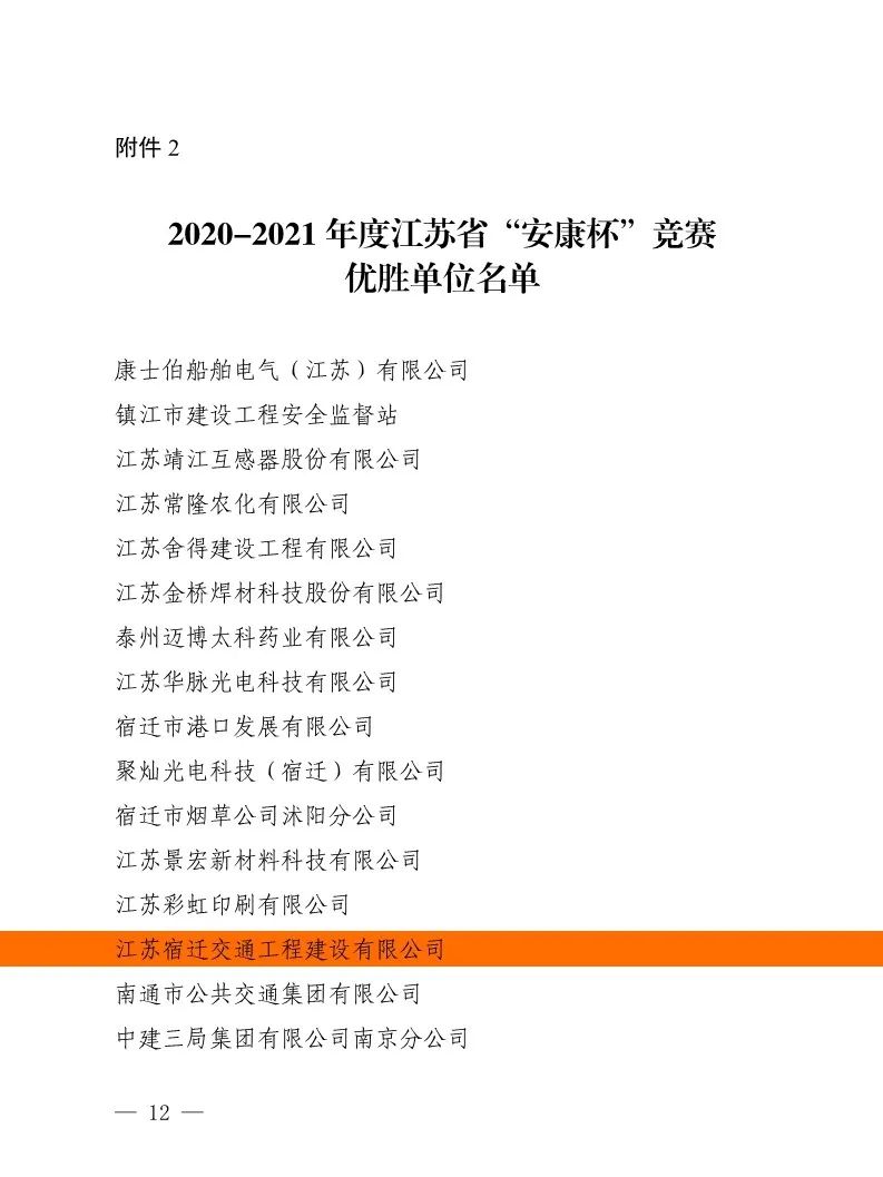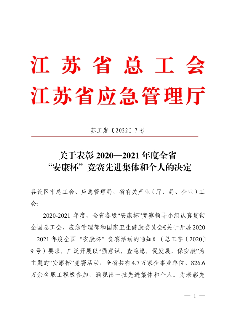 日前,省总工会和省应急管理厅发文通报了2020-2021年度江苏省“安康杯”竞赛评选情况,宿迁交建荣获省“安康杯”竞赛“优胜单位”的荣誉称号。