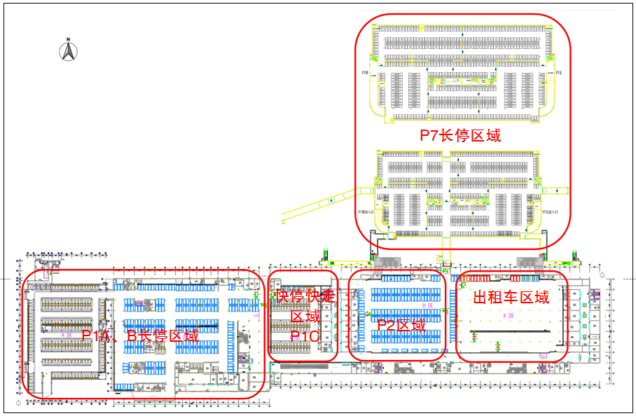 高铁宿迁站地下停车场原设置P1、P2、P3、P7区域,未对区域功能进行细化。实施新收费标准后,将P1区域细分为P1A、P1B、P1C三个功能区,确定P1A、P1B和P7为长停区域,P1C为快??熳咔?,P3为出租车区域。