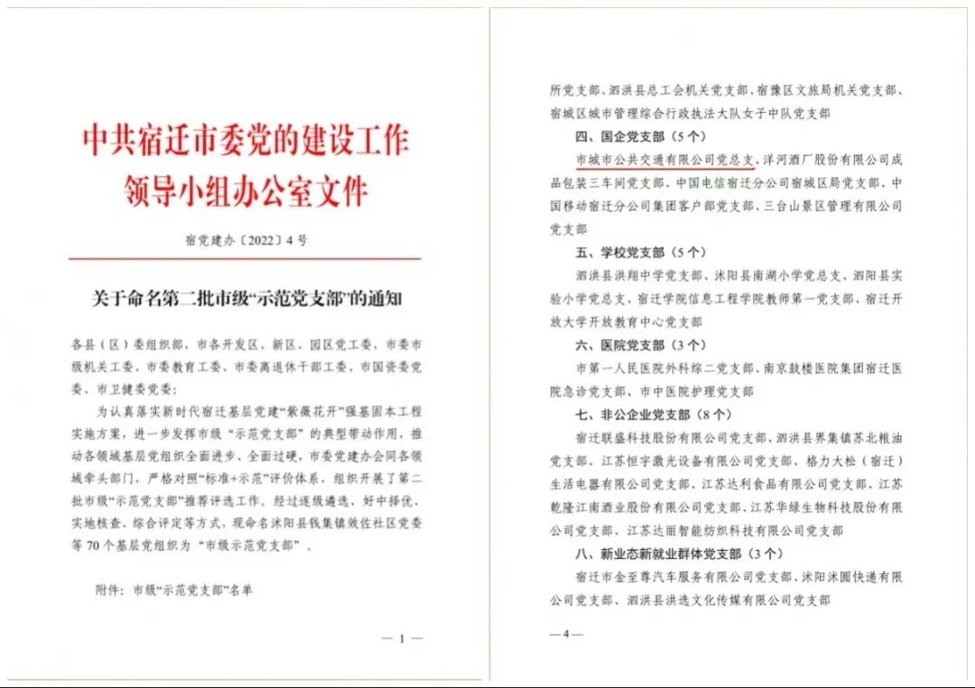 近日,中共宿迁市委党的建设工作领导小组办公室下发《关于命名第二批市级“示范党支部”的通知》,公交公司党总支荣获市级“示范党支部”称号。