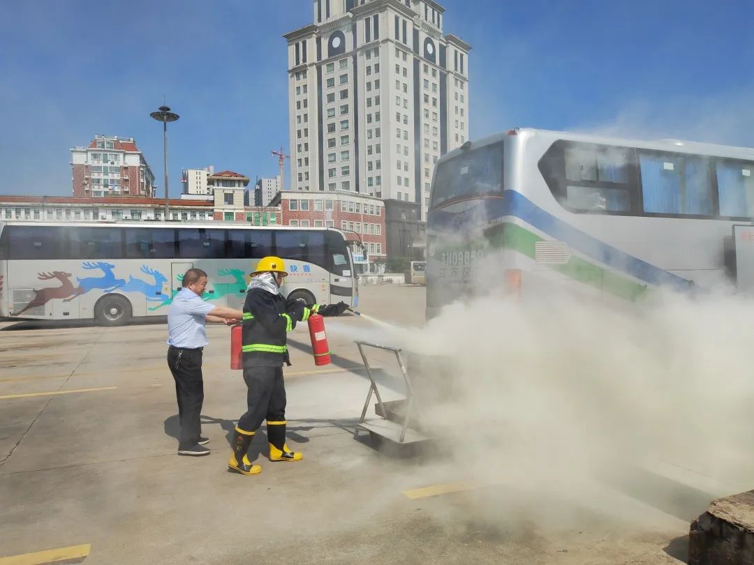 演练过程中,以客车突发“火灾”为背景案例,随着浓烟升起,驾驶员迅速停车打开车门,快速有序疏散车上旅客至安全地带,然后关掉电源取下随车灭火器,对准着火部位正面根部喷射,扑灭火灾,并迅速立即拨打119消防部门报警,真正做到即停车、人撤离、速报警的演练目标要求,达到了预期效果。