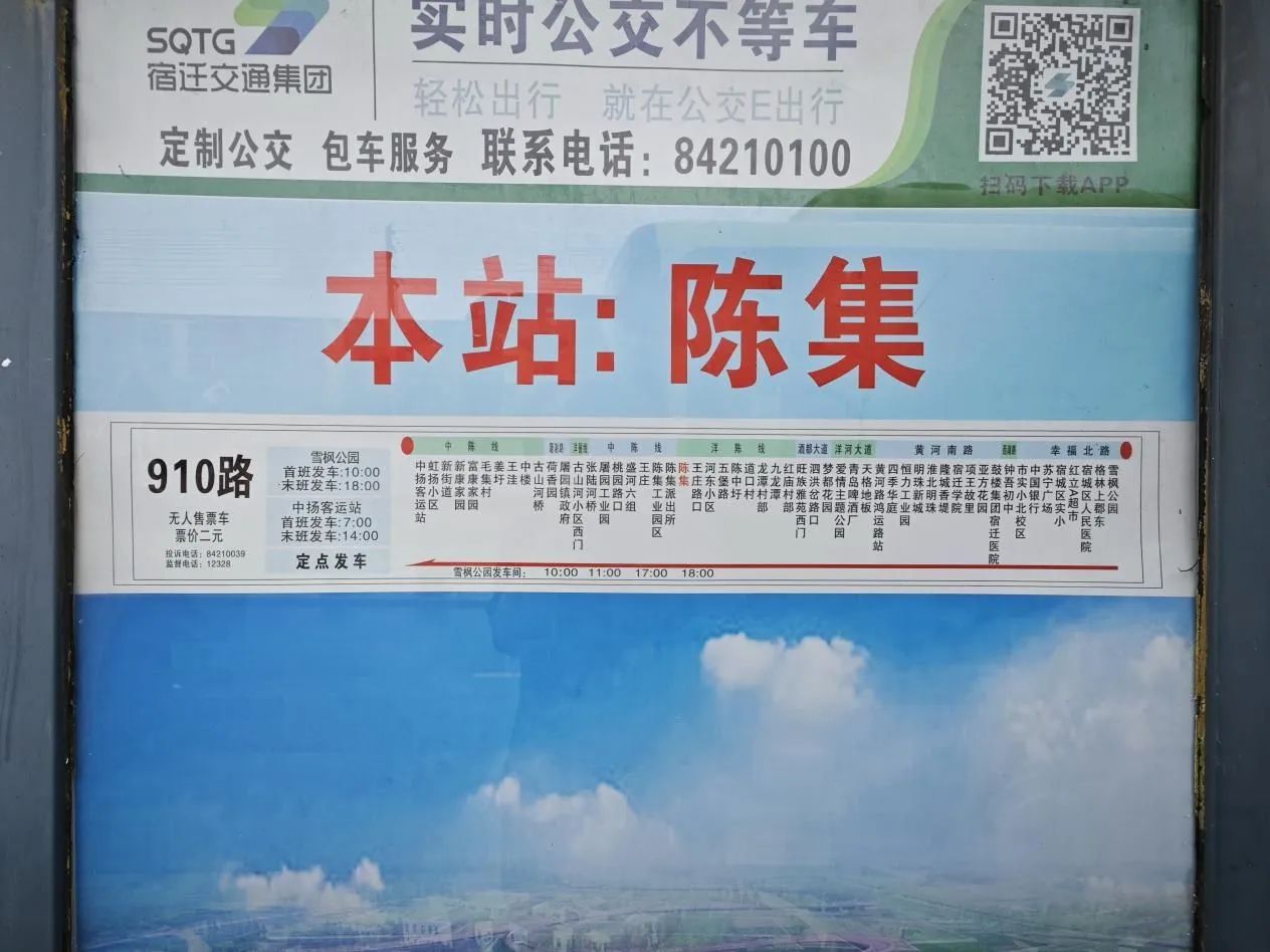 为进一步优化市区公交线网结构,切实解决城乡居民出行需求,自今年8月28日起,宿城区陈集镇、屠园乡、中扬镇这三个乡镇开通了直达市区定时公交910路(雪枫公园公交枢纽站至中扬客运站),沿线站点均可2元公交直达。