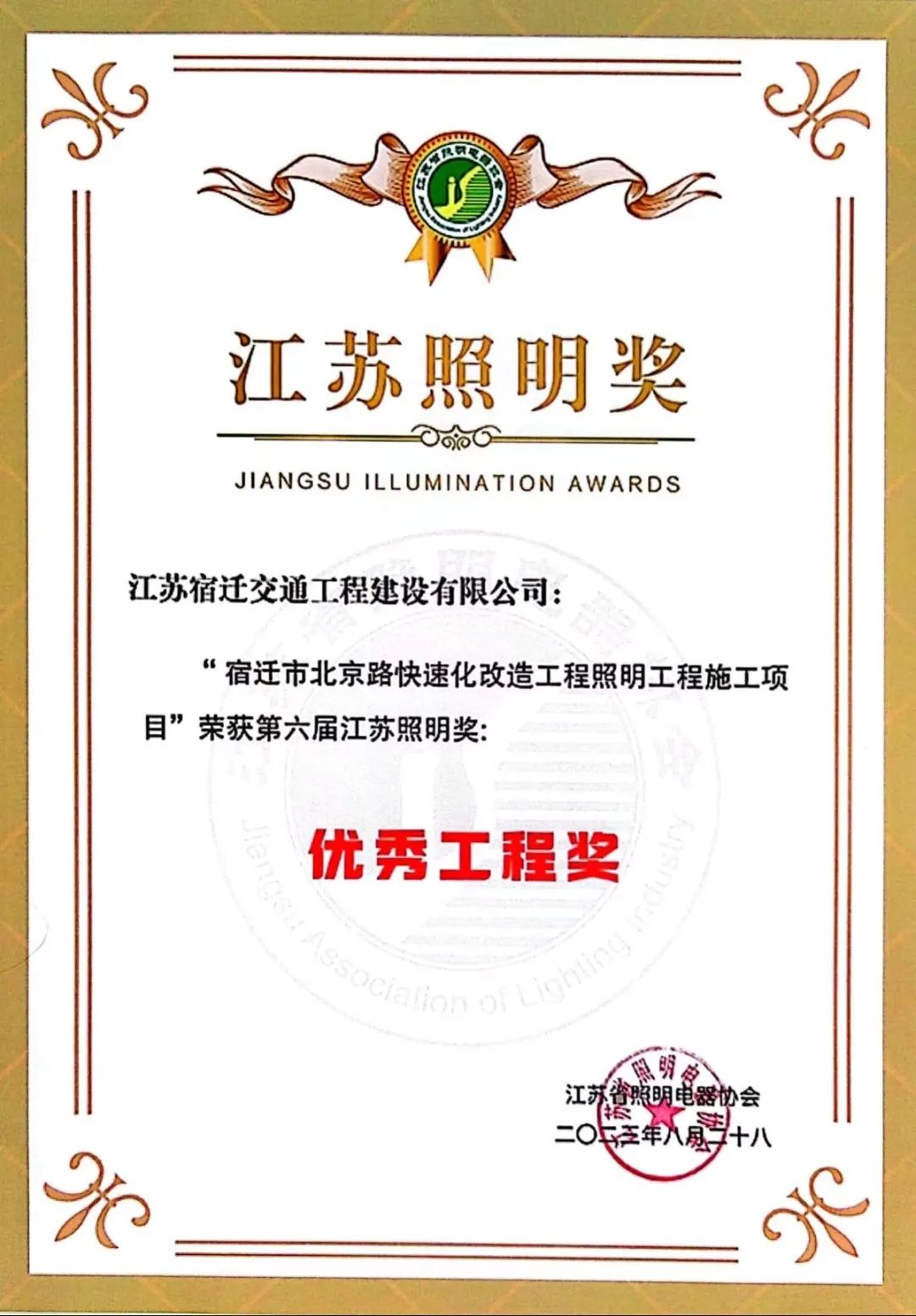 近日,由江苏省照明协会主办,照明奖组委会组织专家评审的第六届江苏照明奖进行了终审并公示评审结果。由宿迁交建承建的宿迁市北京路快速化改造工程照明工程施工项目荣获优质工程奖。