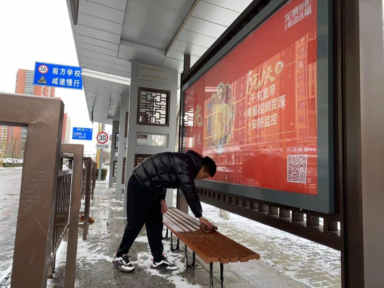 为保障市民安全上下车对公交候车亭进行清扫消除安全隐患