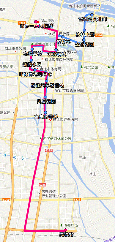 304路,将雪枫公园—宿迁·义乌国际商贸城段调整为市第一人民医院—高铁站,调整后路线为市第一人民医院—颐和路—宿迁大道—发展大道—南湖路—平安大道—骆马湖路—世纪大道—微山湖路—人民大道—上海路—高铁站。