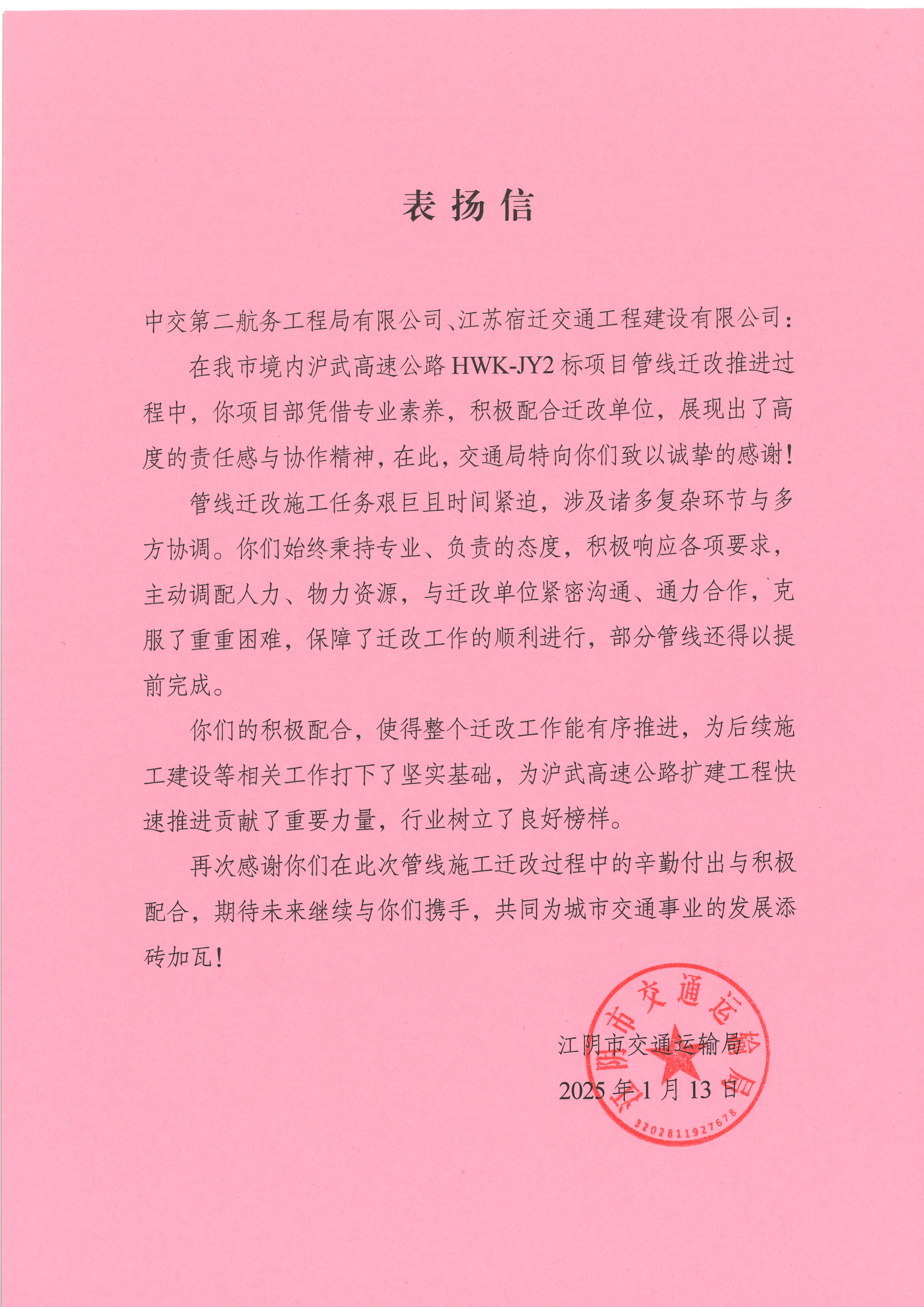 日前,由宿迁交建参建的沪武高速2标项目,连续收到来自沪武锡宜扩建指挥部和江阴市交通运输局的表扬贺信。信中高度肯定了宿迁交建在沪武高速公路2标建设中的卓越表现,充分认可了项目团队的辛勤付出和公司综合实力与专业水平。