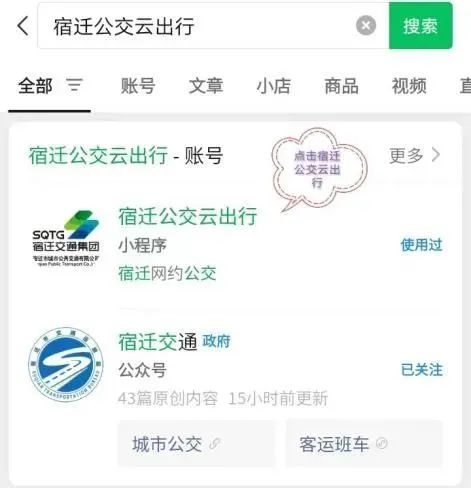 ①微信搜索“宿迁公交云出行”或手机扫公交站台网约公交二维码,进入小程序。