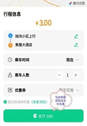 ④勾选我已阅读并同意《乘客须知》、《购票须知》后完成支付,在上车点等候上车。