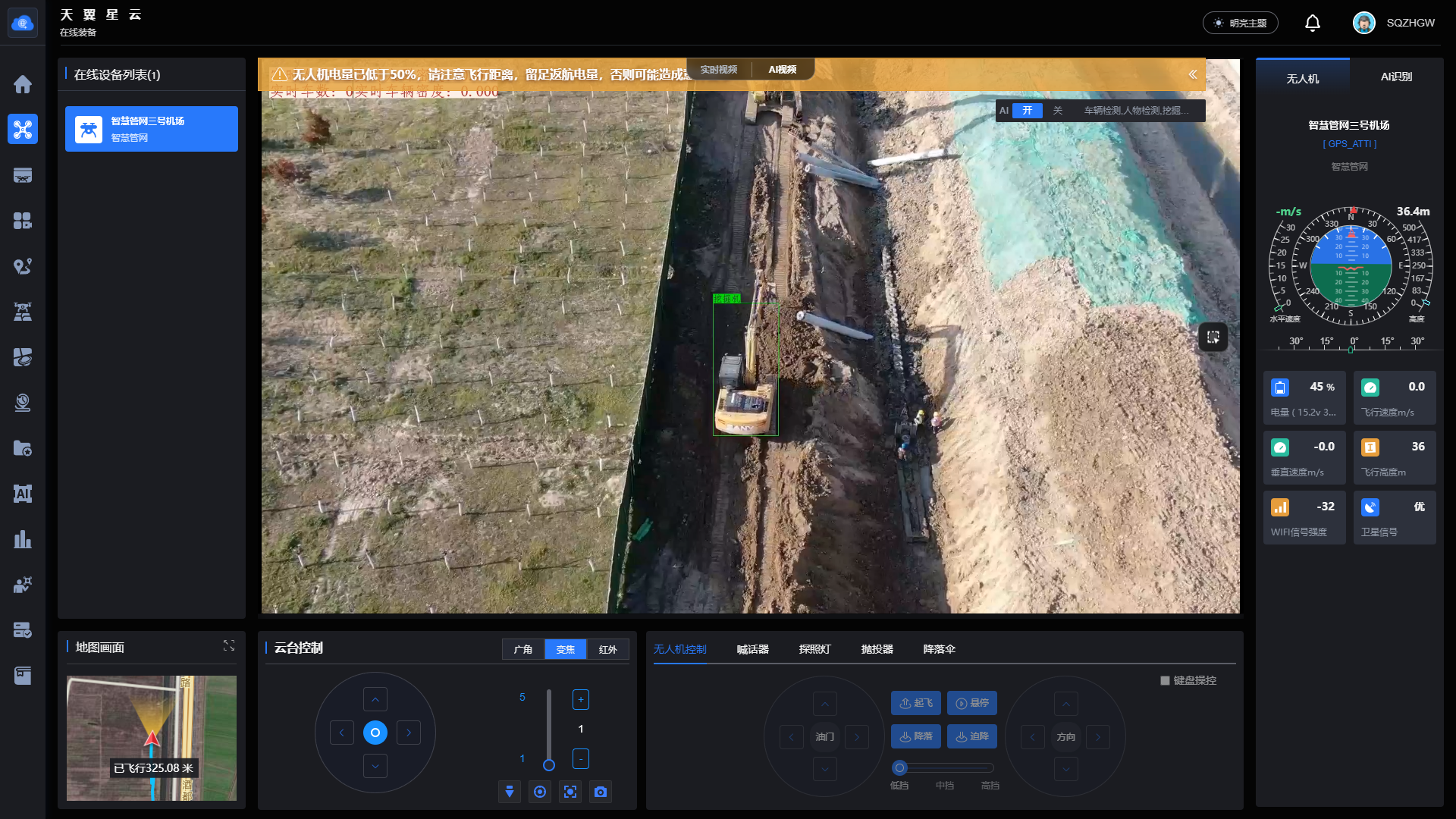 日常工作期间,“智能巡检员”按照预设航线自动巡检,配置高精度变焦相机,依托“平台+无人机+AI”技术,实时捕捉未佩戴安全帽、围挡破损倾覆等典型隐患行为,并自动标记位置、推送预警、督促整改,形成全链条管理闭环。巡航过程中,还实时监控工程车辆位置与作业状态,智能识别违规占道、超区域作业等异常情况,及时提醒优化施工动线。