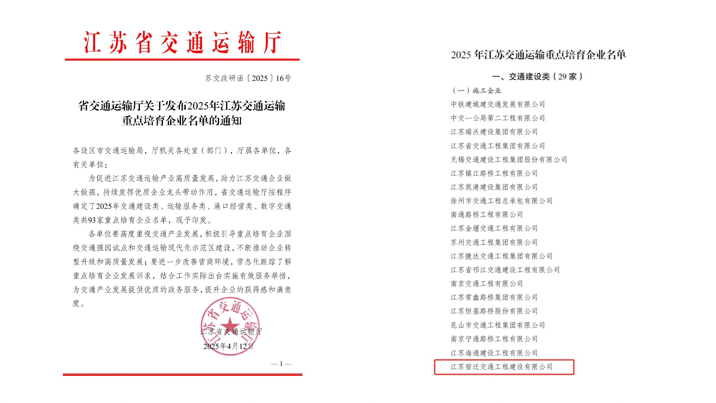近日,江苏省交通运输厅正式揭晓《2025年江苏省交通运输重点培育企业名单》,其中,宿迁交建凭借综合实力、技术创新能力等方面优势成功入选。自2023年入选首届“江苏交通建设企业20强”,到2024年完成更名后再度蝉联这一荣誉,宿迁交建用实力彰显了其在全省交通建设领域的地位,诠释着国有企业的使命担当 。