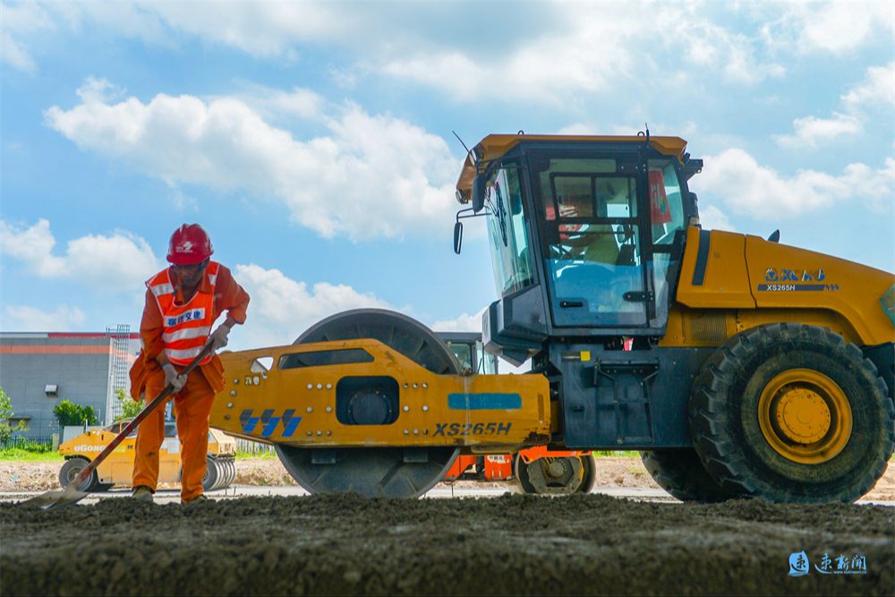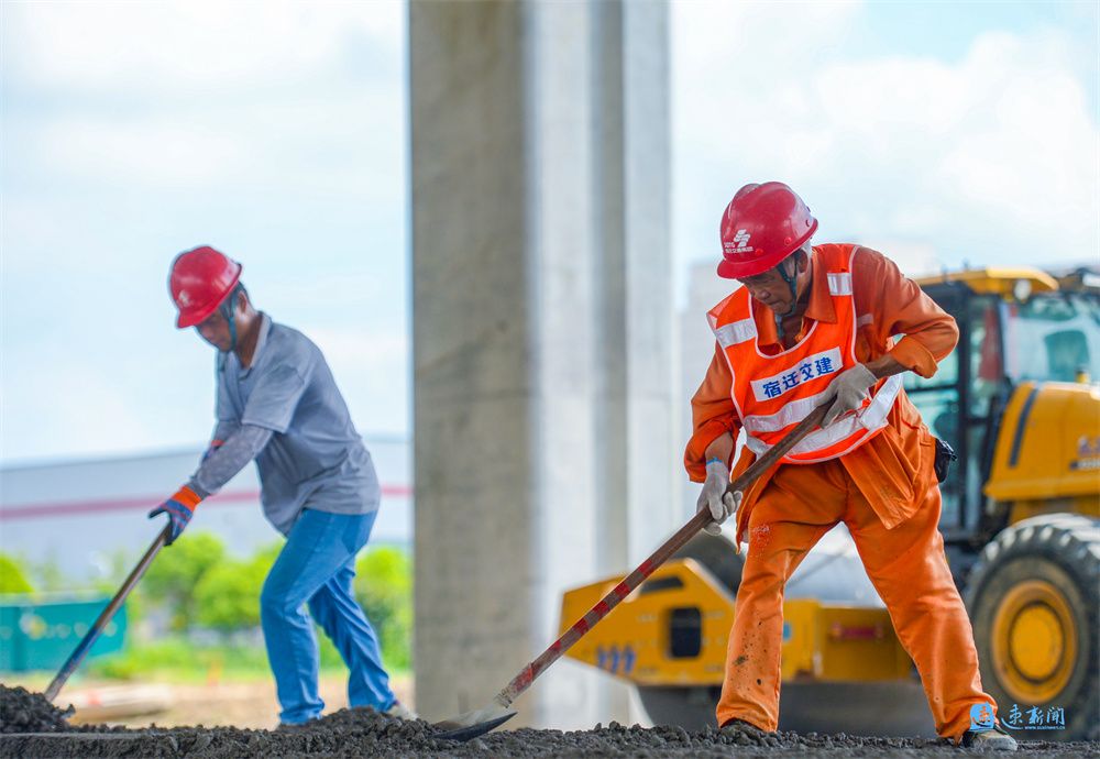 7月22日,在宿迁市宿豫区酒都路快速化改造工程现场,建设者们在高温下加紧施工,全力推进项目建设。
