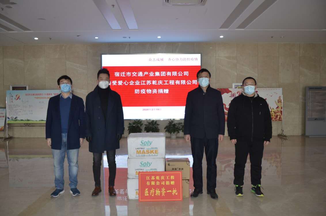 2月19日,爱心企业江苏乾庆工程有限公司将一批承载着对疫情防控一线人员满满关怀的防疫物资赠送给宿迁交通集团,支援集团疫情防控工作,传递抗“疫”正能量。