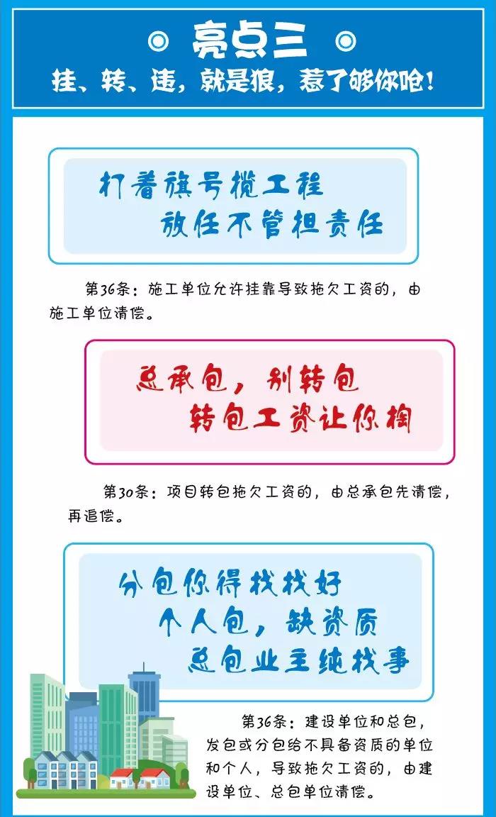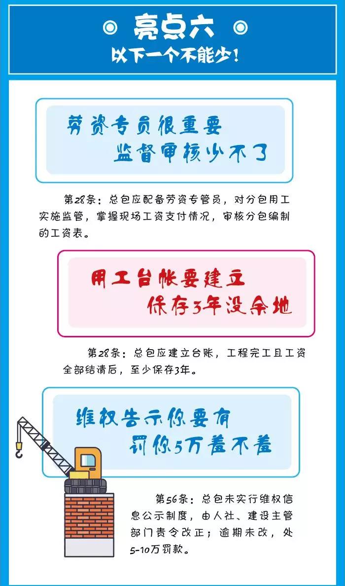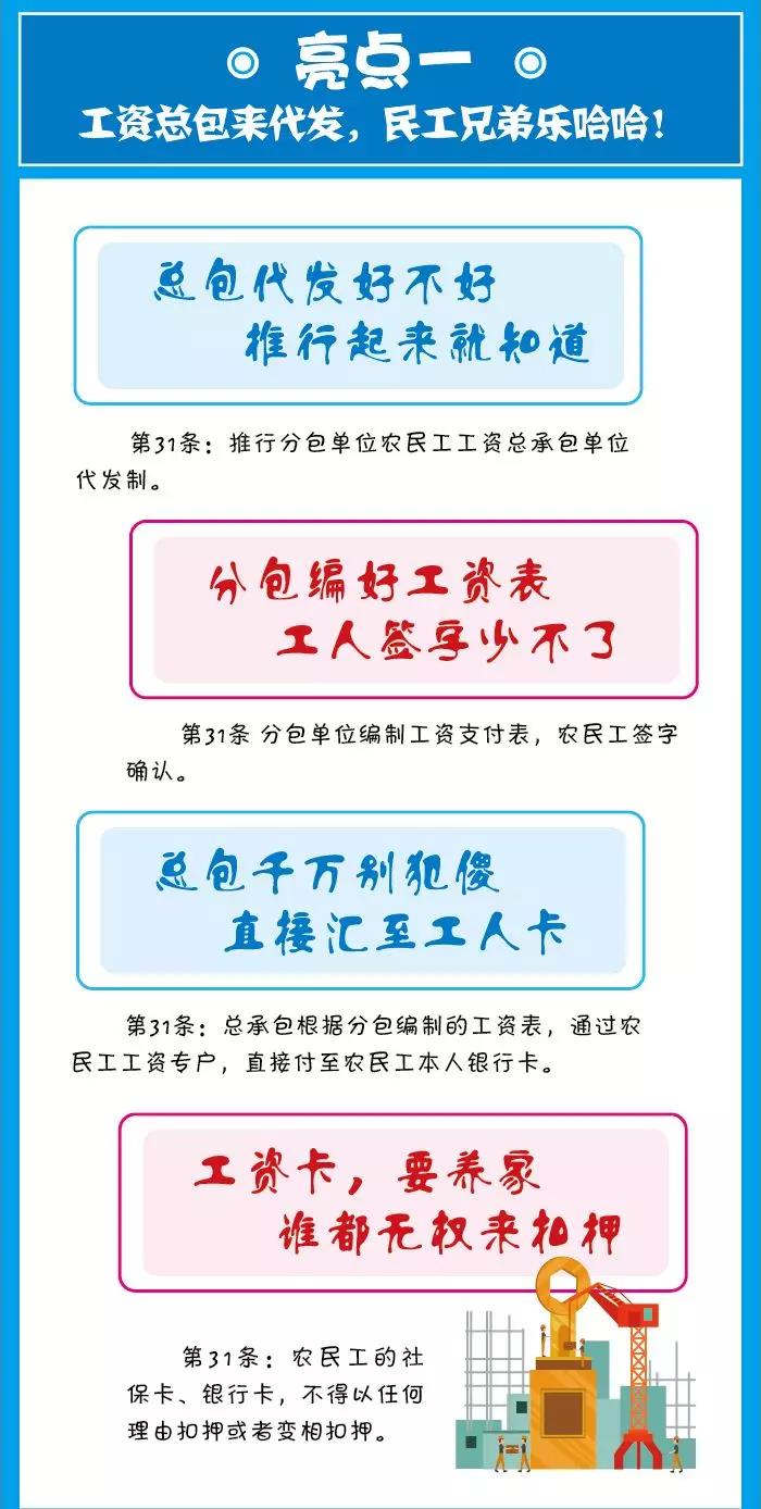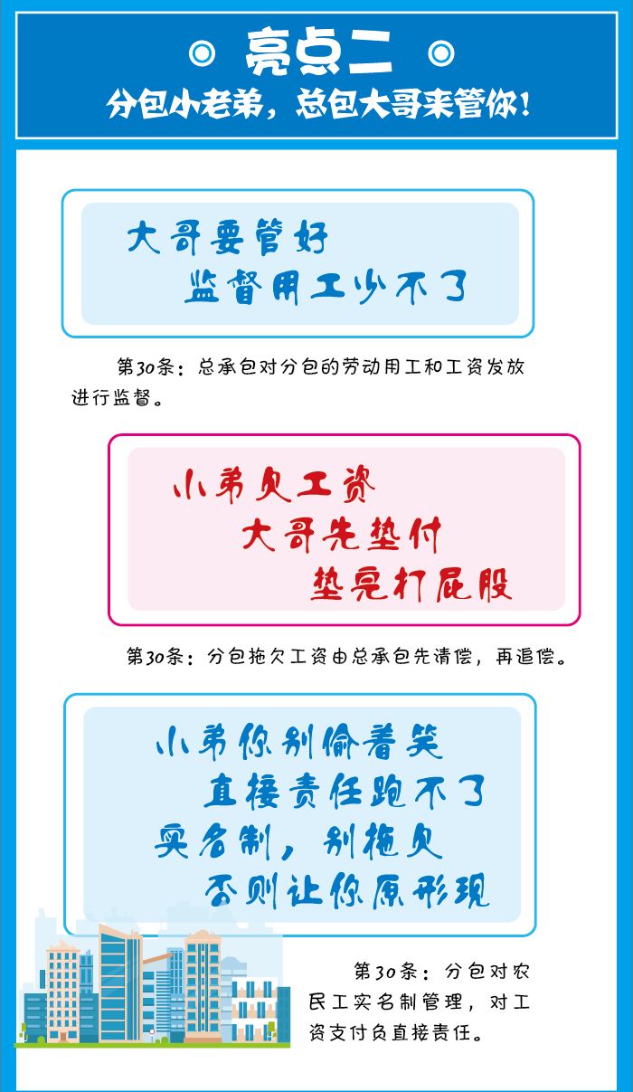 该条还规定了总包单位对分包单位的用工和工资发放进行监督的责任,这跟之前的总包单位单纯的收取配合费而对放任分包单位的用工及工资发放。这也为保障农民工能切实拿到工资提供了法律依据。