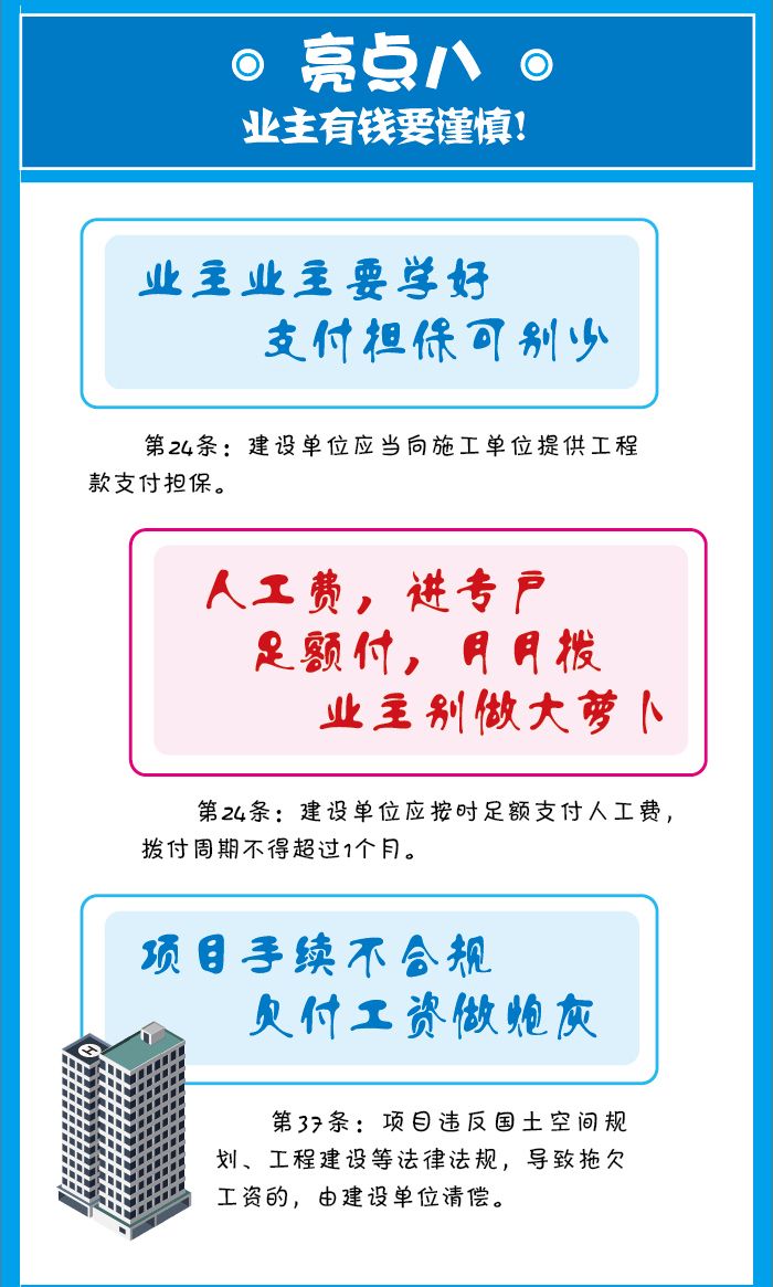该条规定了建设单位应向施工单位提供工程款支付担保,以确保其能按时足额支付工程款。建设单位和施工承包单位约定人工费的拨付周期,且周期不得超过1个月,该条款保证了农民工工资能按月予以支付,保障农民工能按月拿到工资。