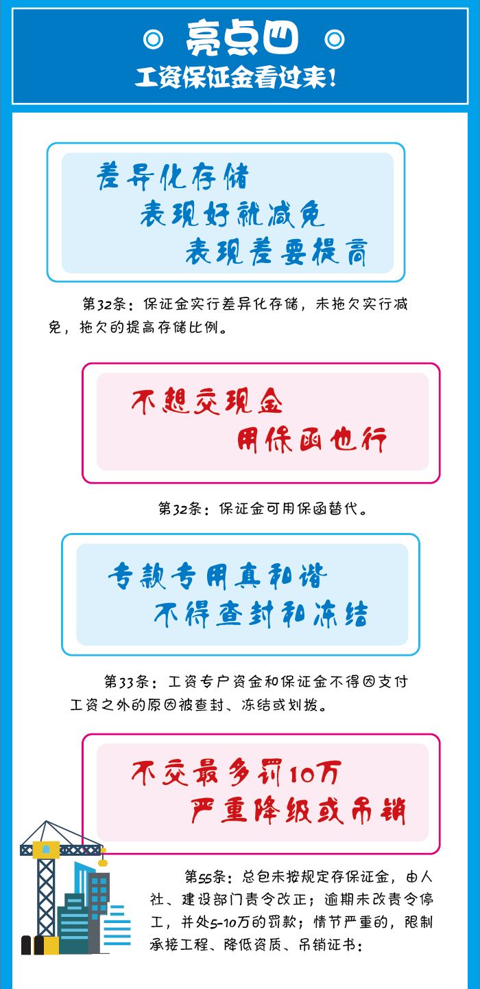 为切实保障总包能代发工资,《条例》规定其要存储一定的工资保证金,工资保证金的数额施行差异化存储,未拖欠单位的比例降低,拖欠的提高比例。该工资保证金也可用金融机构的保函代替,要注意此处是金融机构的保函,不是普通的担保公司的保函。
