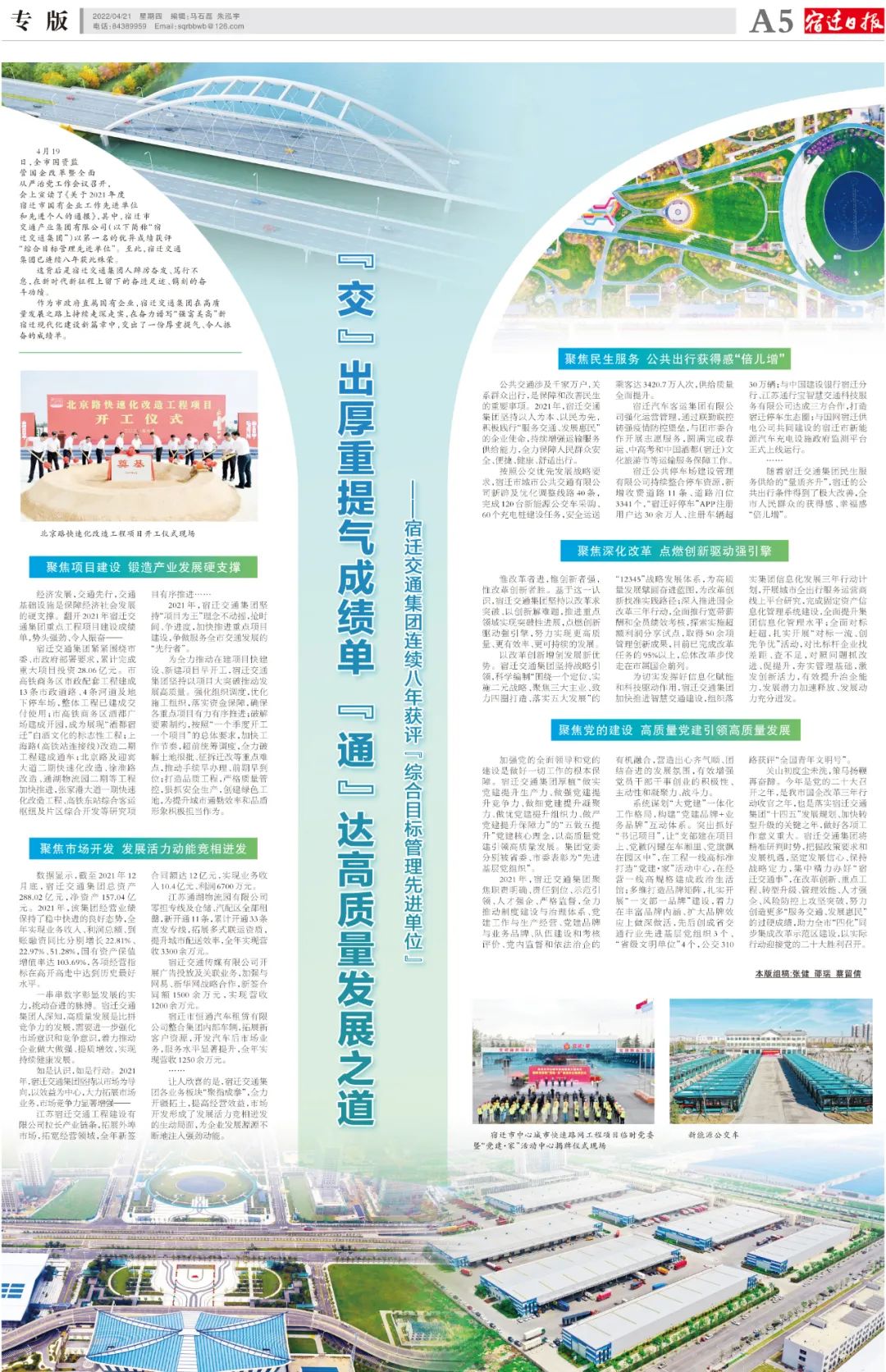 4月21日,《宿迁日报》以《“交”出厚重提气成绩单 “通”达高质量发展之道——宿迁交通集团连续八年获评“综合目标管理先进单位”》为题,专版报道了集团2021年聚焦项目建设、市场开发、民生服务、深化改革、党的建设等方面奋力取得的优异成绩。全文报道如下: