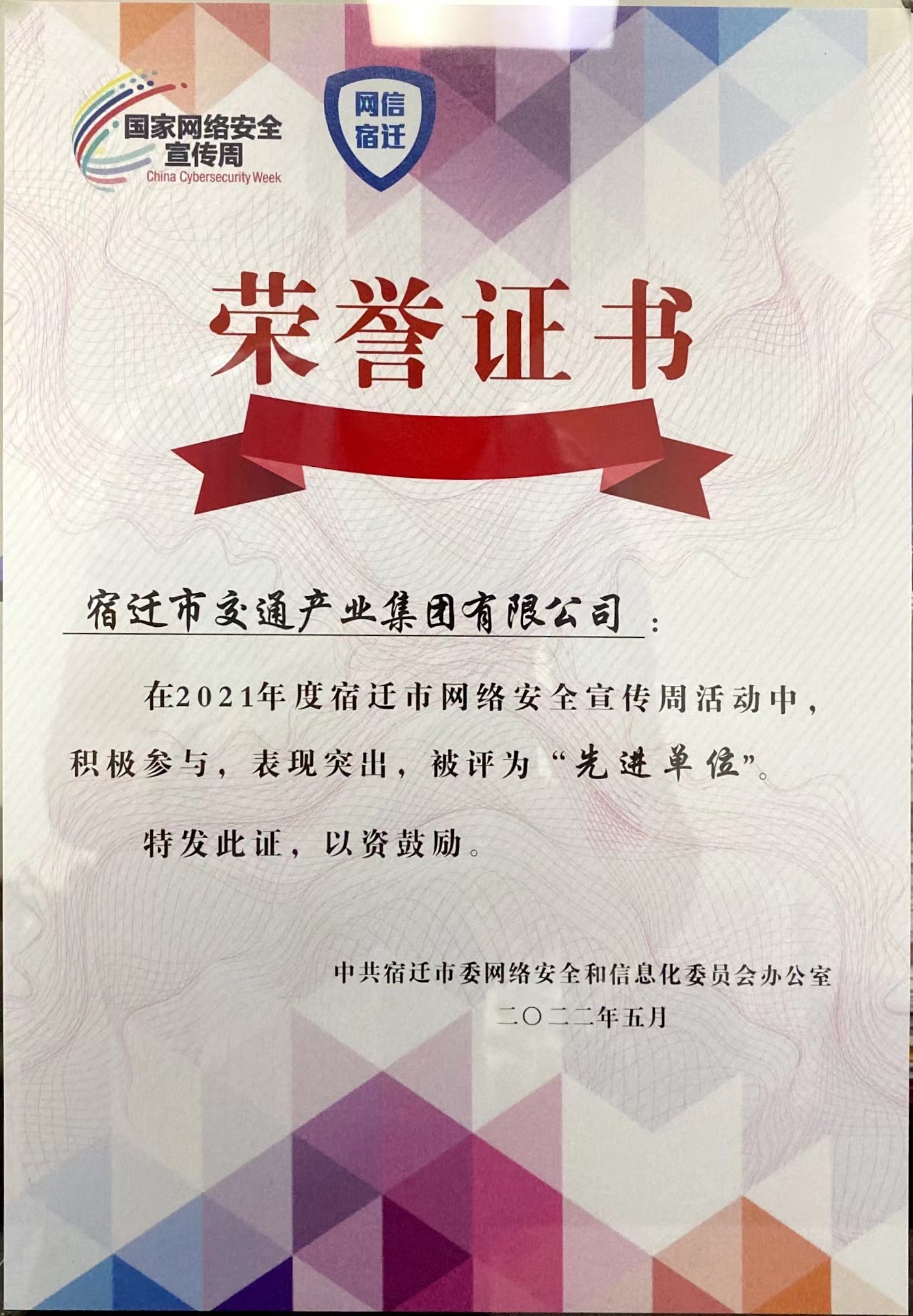 宿迁交通集团荣获2021年度宿迁市网络安全宣传周活动先进单位