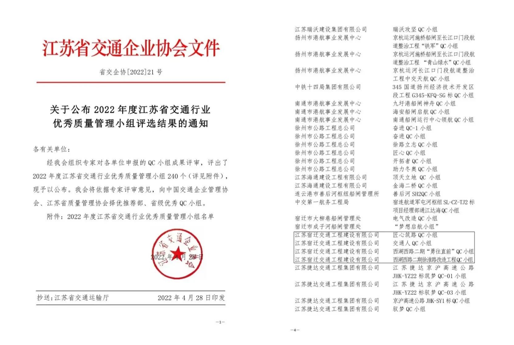 近日,江苏省交通企业协会公布2022年度江苏省交通行业优秀质量管理小组评选结果,宿迁交建徐淮路改造工程项目QC小组及“勇往直前”QC小组、匠心筑路QC小组、交通人QC小组荣获“2022年江苏省交通行业优秀质量管理小组”称号。