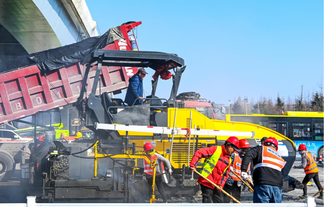 2月19日,洪泽湖路路口顺利完成沥青下面层施工;