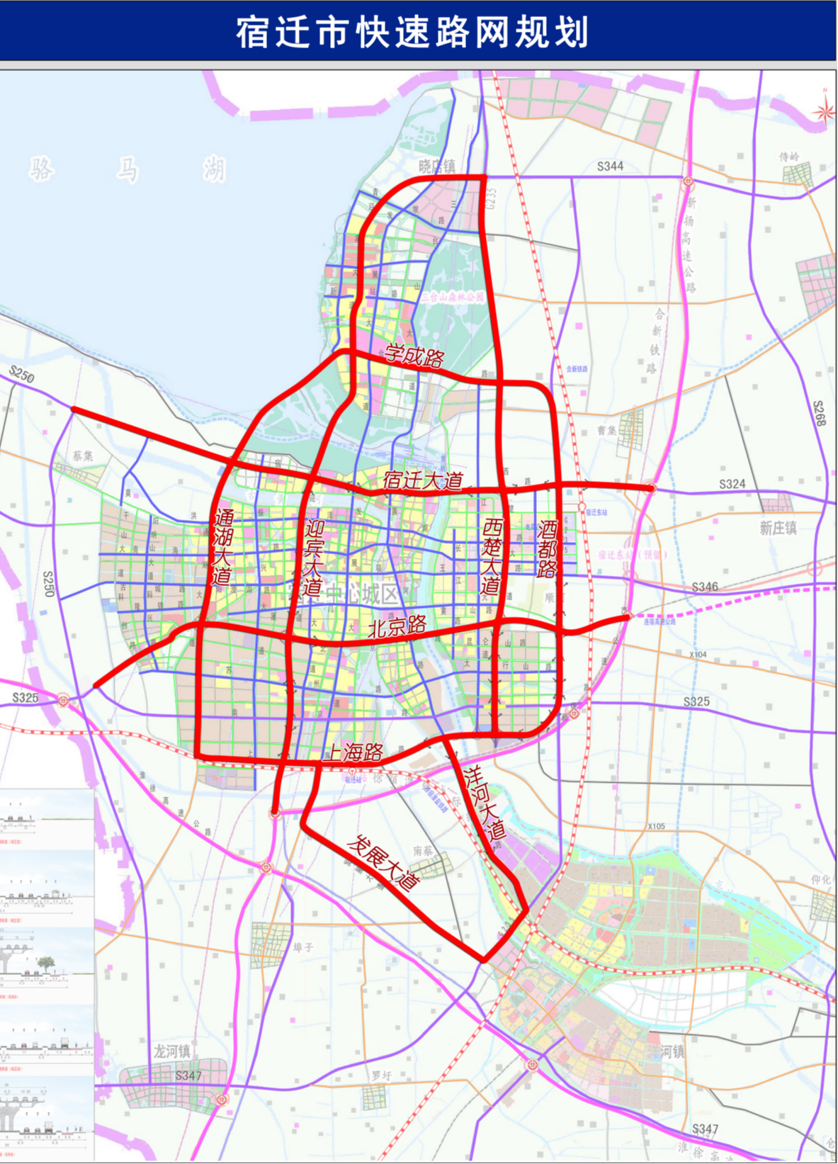 经济发展,交通先行。根据《宿迁市快速路网规划(修编)(2018—2035)》,宿迁市“二环十射”快速路网总里程达166公里。其中,“内环”由迎宾大道、北京路、西楚大道、宿迁大道(原宿支路)构成,长24公里;“二环”由通湖大道、上海路、酒都路、学成路构成,长55公里;“十射”为迎宾大道北延、新扬高速连接线、西楚大道北延、富春江路、宿迁大道东延、宿迁大道西延、北京路东延、北京路西延、黄河南路、发展大道,总长87公里。