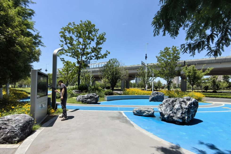 北京路绿道全长11.5公里,在北京路道路两侧宽约15~70米的绿地景观内建设生态绿道,将绿色空间融入居住、商业等场所,形成城林融合的生态大公园,为周边群众提供了休闲漫游、林荫漫步、新氧畅游的绿道体验。充分利用中运河两岸桥下灰色空间,设计桥下公园与海绵生态绿地,结合周边环境的功能需求与城市公交线路规划,在运河两岸的桥下空间形成集人文生态绿地、休闲健身活动场地、集中停车场、公交场站等多重功能综合利用的桥下公园场地,打造北京路中运河两岸的创新记忆点。