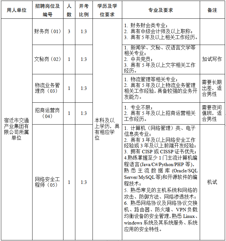 5. 具备招聘岗位要求的其它资格和条件。具体详见《宿迁市交通产业集团有限公司2024年秋季招聘岗位表》。