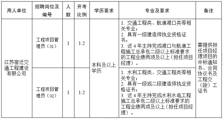 5. 具备招聘岗位要求的其它资格和条件。具体详见《宿迁市交通产业集团有限公司工程技术人员招聘岗位表》。