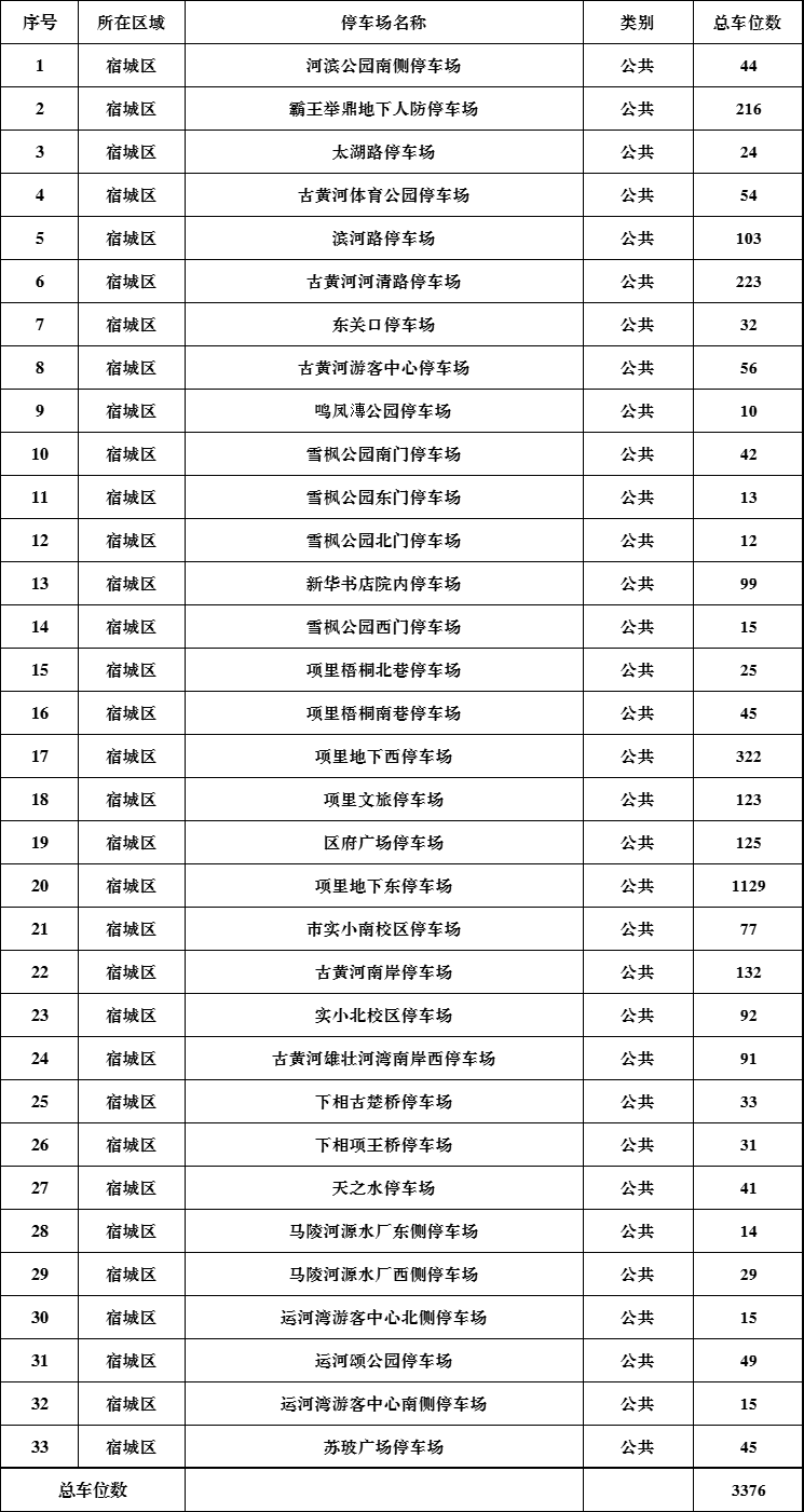 免费开放的停车区域为宿迁公共停车场建设管理有限公司管辖的收费公共停车场33个,停车泊位3376个;收费道路41条,停车泊位4821个,停车泊位总计8197个(具体位置见下方信息表)。