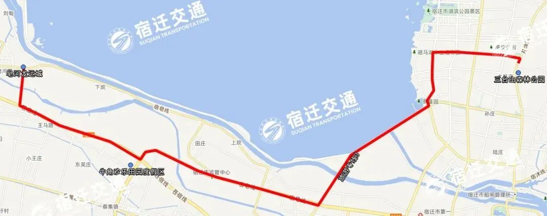 3、“射线2”:旅游专线3(三台山森林公园—皂河龙运城),途经路线:三台山森林公园—新站路—迎春大道—环湖大道—通湖大道—宿迁大道—324省道—牛角欢乐田园度假区—324省道—250省道—龙运大道—皂河龙运城。停靠站点:三台山森林公园—牛角欢乐田园度假区—皂河龙运城。线路里程27公里,车辆和班次安排:每天8:00、9:00、10:00、11:00、14:00、15:00、16:00发班,计划投入4辆车。